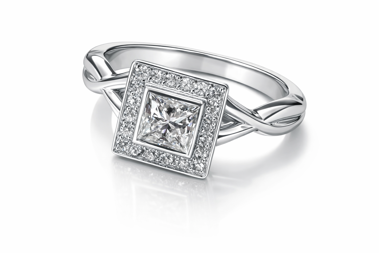 At its heart lies a brilliant lab-grown princess-cut diamond, ethically created and set within a sparkling halo of smaller lab diamonds, evoking light and clarity born from love. The signature twisted infinity band—crafted in your choice of luxurious silver, gold, or platinum—represents eternal connection and unbreakable bonds.