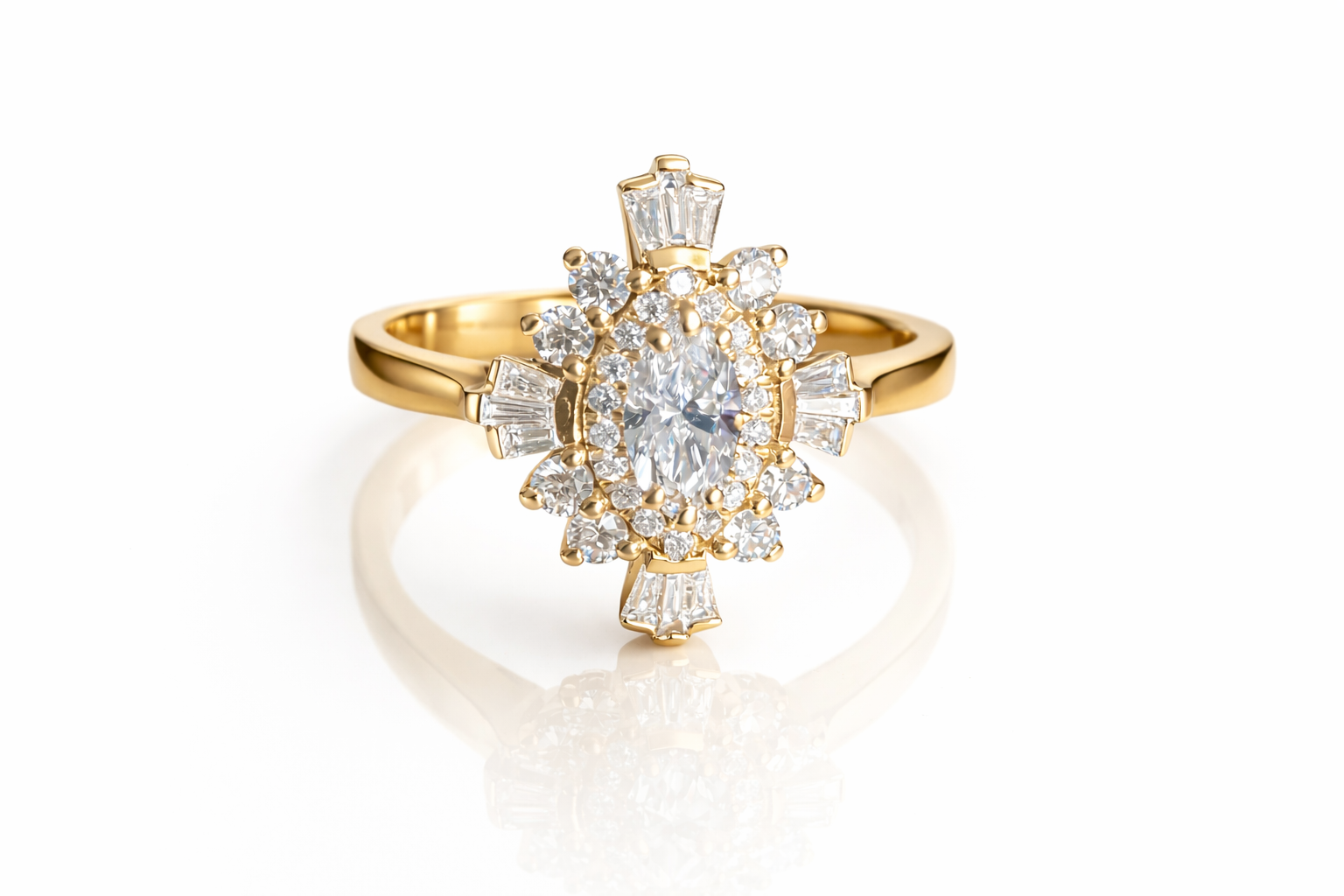Surrounding the central stone is a radiant halo of sparkling round brilliant diamonds, creating a dazzling sunburst effect that amplifies the center diamond’s brilliance and gives the ring a luxurious, vintage-inspired floral appearance. Flanking the halo are clusters of baguette-cut diamonds arranged in a symmetrical, star-like pattern, adding geometric sparkle and depth while enhancing the overall radiance.